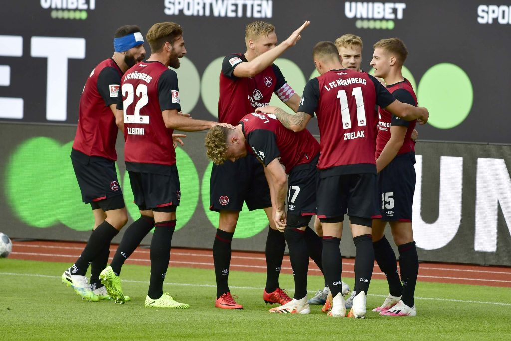 Nürnbergs Torschütze zum 2-0, 15-Fabian Nürnberger (links) dreht jubelnd ab. Rechts Nürnbergs 9-Mikael Ishak.