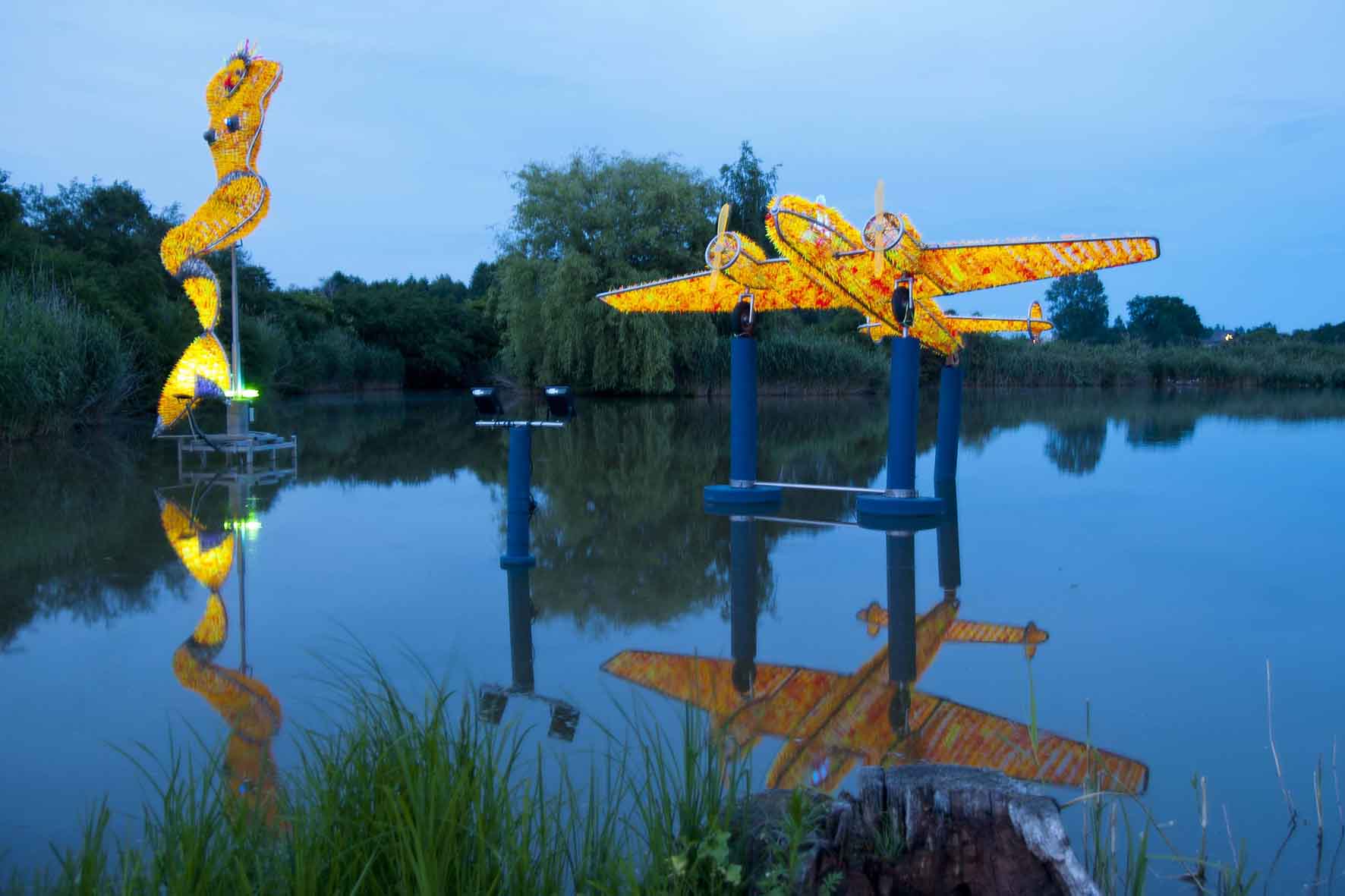 Die Ausstellung des Erlanger Künstlers Dieter Erhard geht auf eine Initiative engagierter Bürgerinnen und Bürger Kleingründlachs zurück und zeigt fünf großformatige Skulpturen auf dem Kleingründlacher Schwemmweiher. Die Upcycling- Kunstwerke aus Edelstahl und fluoreszierendem Plexiglas leben von ihrer Leuchtkraft, einem Effekt, der entsteht, wenn sich das Licht an den Fräskanten des Kunststoffs bricht.