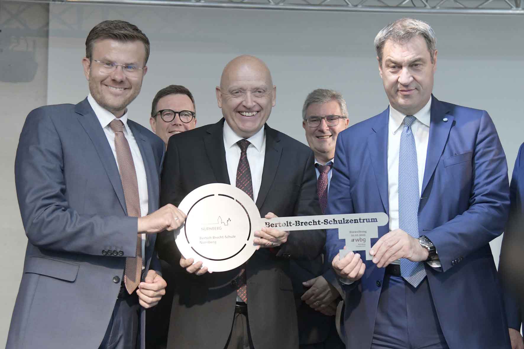 Titelfoto: Schlüsselübergabe durch Oberbürgermeister Marcus König und Ministerpräsident Markus Söder an den Schulleiter Oberstudiendirektor Harald Schmidt