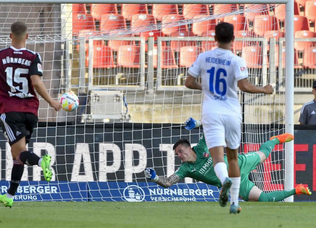 Heidenheims #1 Kevin Müller (hinten) wehrt einen Nürnberger Torschuss ab