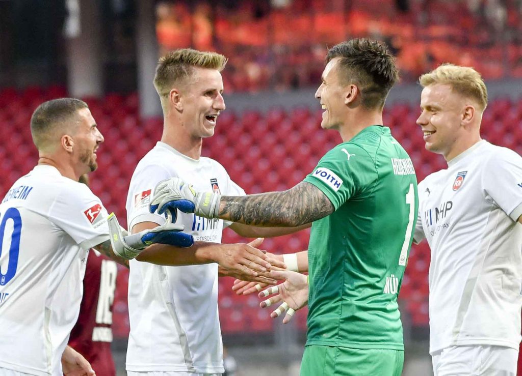 Jubel nach Spielende bei Heidenheims Spielern, hier #3 Jan Schöppner (li.) und Torwart #1 Kevin Müller (re.).