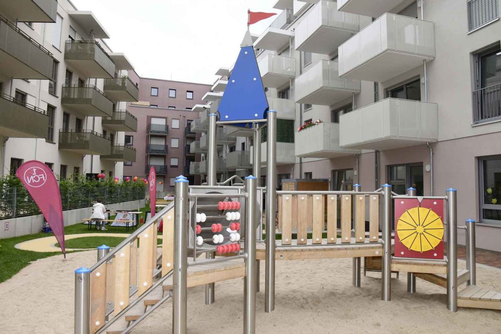 Im Innenhof gibt es einen großen Spielbereich mit Rutsche