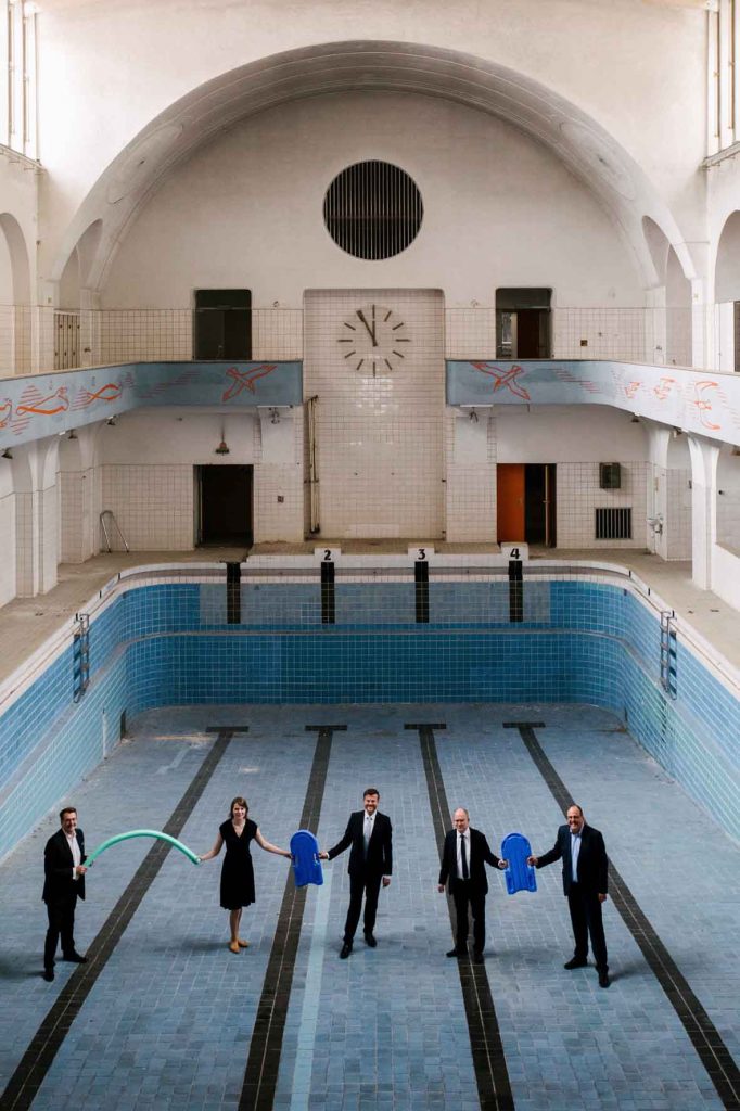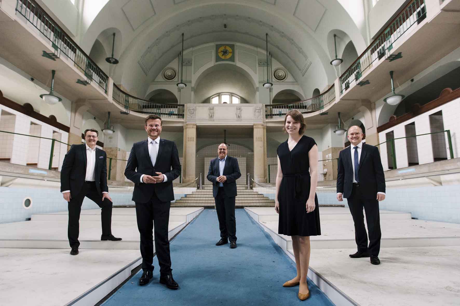 Brückenschlag im Becken des Volksbads: Michael Frieser MdB, Emmi Zeulner MdB, Oberbürgermeister Marcus König, Sebastian Brehm MdB, Bürgermeister Christian Vogel (von links nach rechts).
